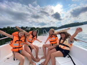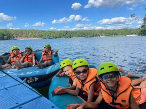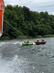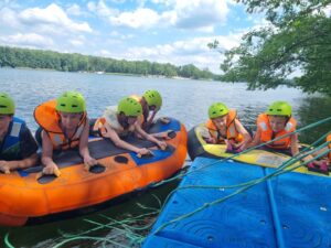 W trakcie zajęć na wodzie (motorówka,  trampolina wodna, wodne dmuchańce, rowery wodne, kajaki…) dzieci zabezpieczone są sprzętem asekuracyjnym (kamizelkami ratunkowymi dopasowanymi indywidualnie do dziecka).