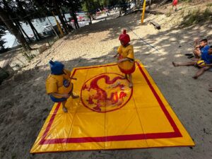 KOLONIJNY PARK WODNY: skoki na wodnym batucie-trampolinie, zjazdy do wody, wyskoki z platformy, podrzuty z katapulty i wspinaczka po ściance;