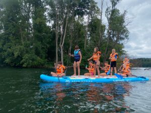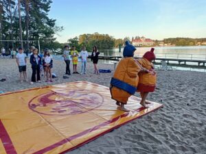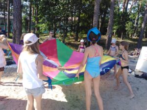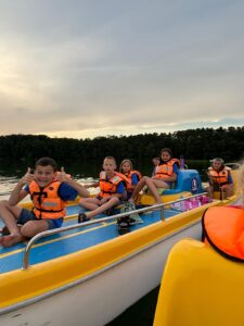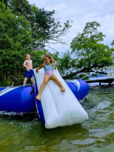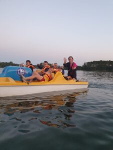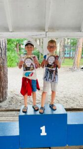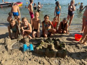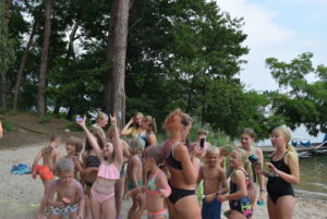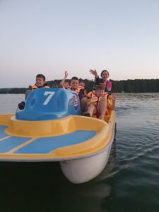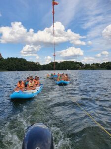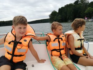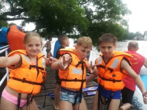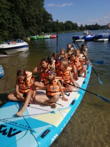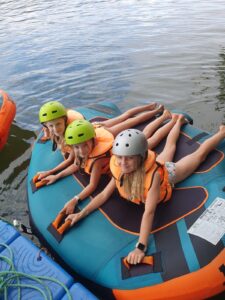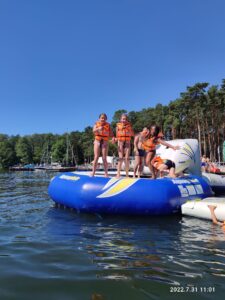 | Od uczestników kolonii nie jest wymagana umiejętność pływania. W trakcie zajęć na wodzie (motorówka, trampolina wodna, wodne dmuchańce, supy, rowery wodne, kajaki…) dzieci zabezpieczone są sprzętem asekuracyjnym (kamizelkami ratunkowymi dopasowanymi indywidualnie do dziecka). |